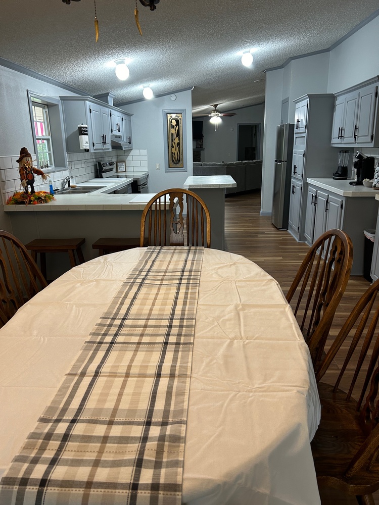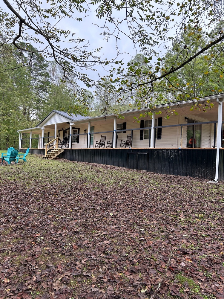 If you are looking for a secluded, peaceful and gorgeous country setting on 5 private acres with a fishing pond and gated security, this is the home for you. It is located in Tackett Creek and just one mile from the Tackett trailhead. It is a lovely 3 bedroom home, with 2 spacious baths that has been completely renovated from top to bottom. The eat in kitchen has all new appliances including washer/dryer, full size refrigerator, microwave, dishwasher, electric full size range and Keurig coffee station. Bedroom number one has 2 queen beds and a walkin closet, bedroom number two has 1 queen bed and a walkin closet, bedroom number 3 has two queen beds and 2 twin beds that are inside a large walkin closet. This home can accommodate 12 guests comfortably. Enjoy the beautiful wrap around porch that overlooks a huge 10 acre lake. There is lots of parking available along with a covered pavillion for your off road vehicles. All linens and hospitality supplies are provided along with a large picnic table and a charcoal grill.